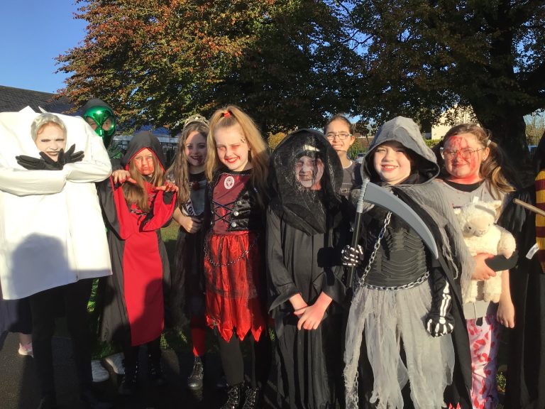 Ghosts, goblins, witches and zombies descended down on St. Brigid’s School today. They went on a walk through the town terrifying all those who were
